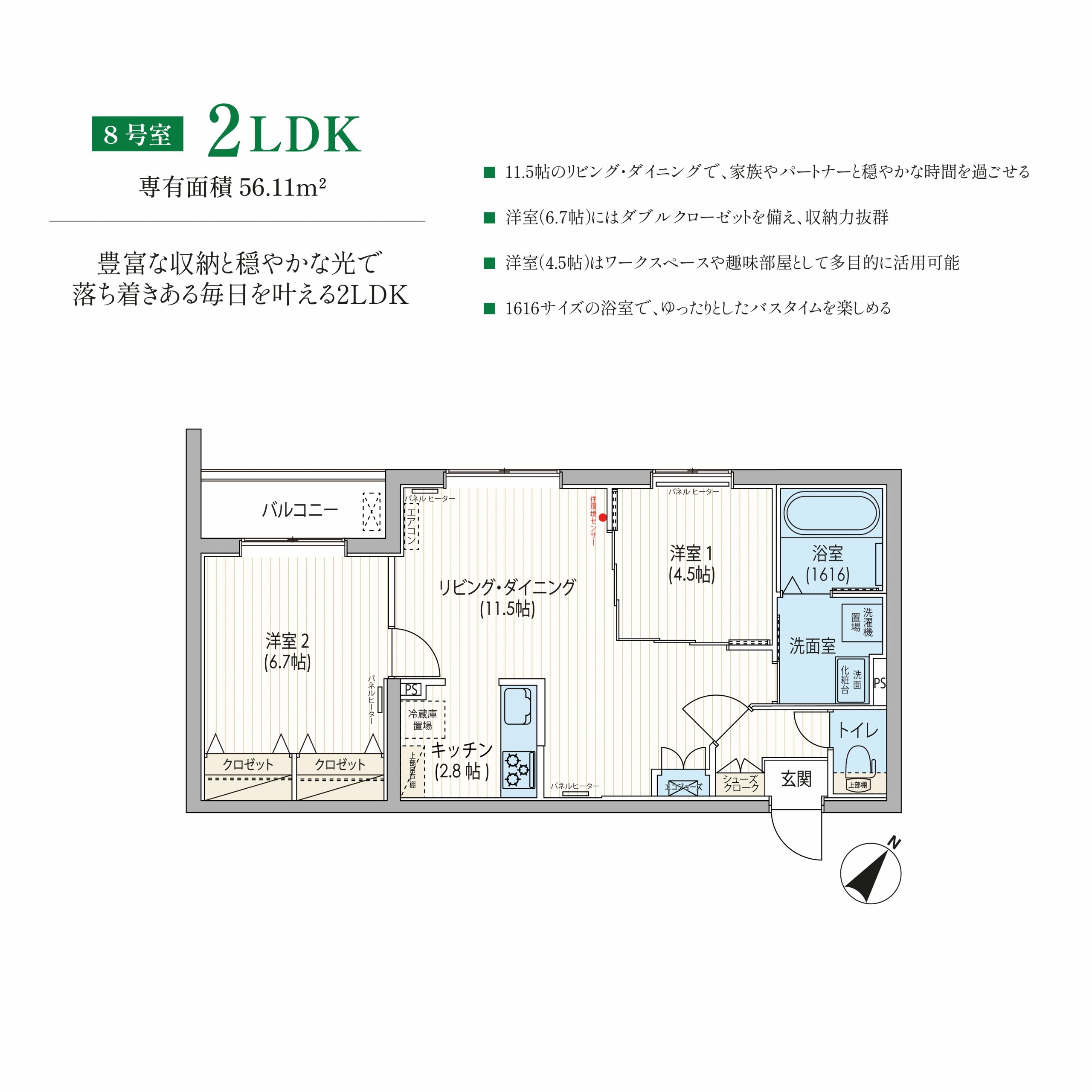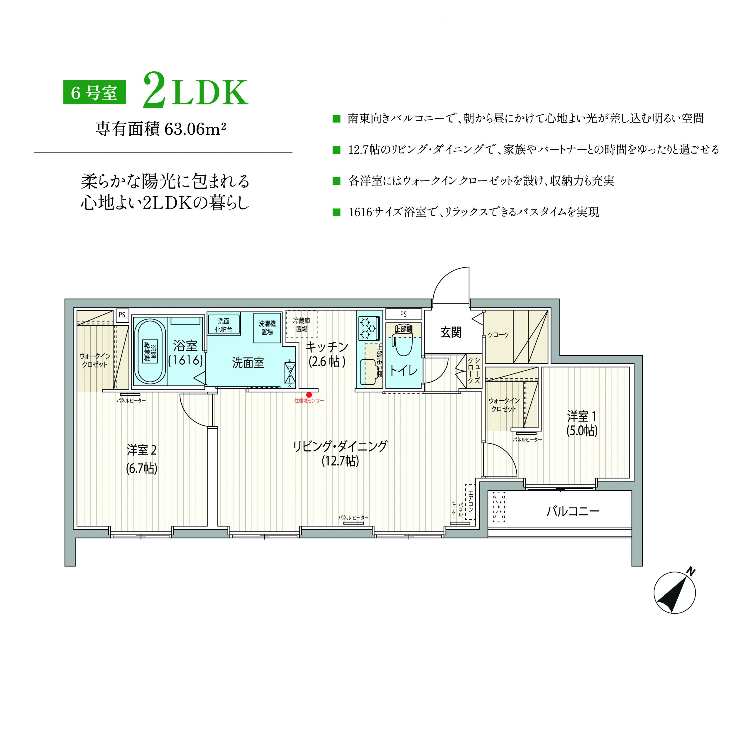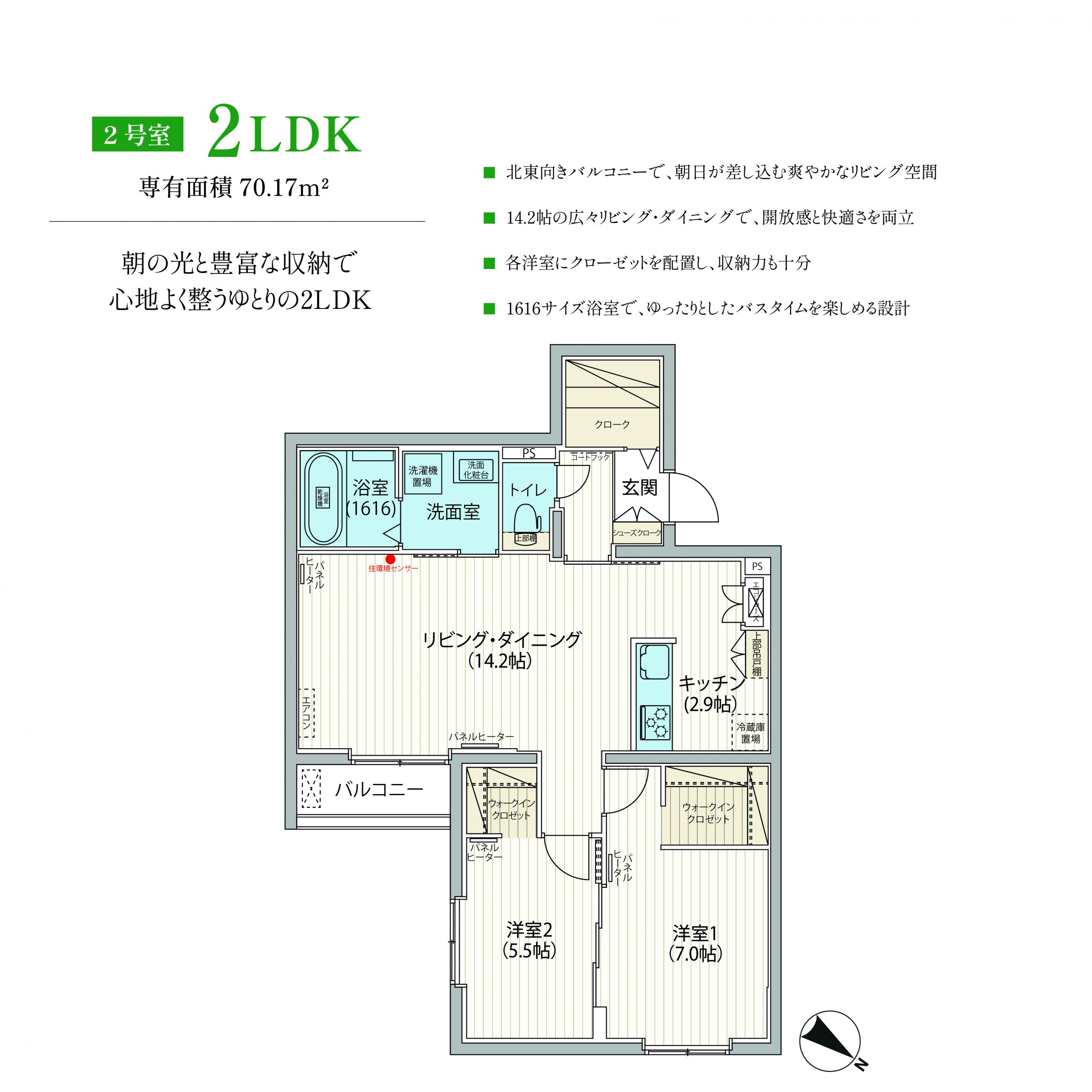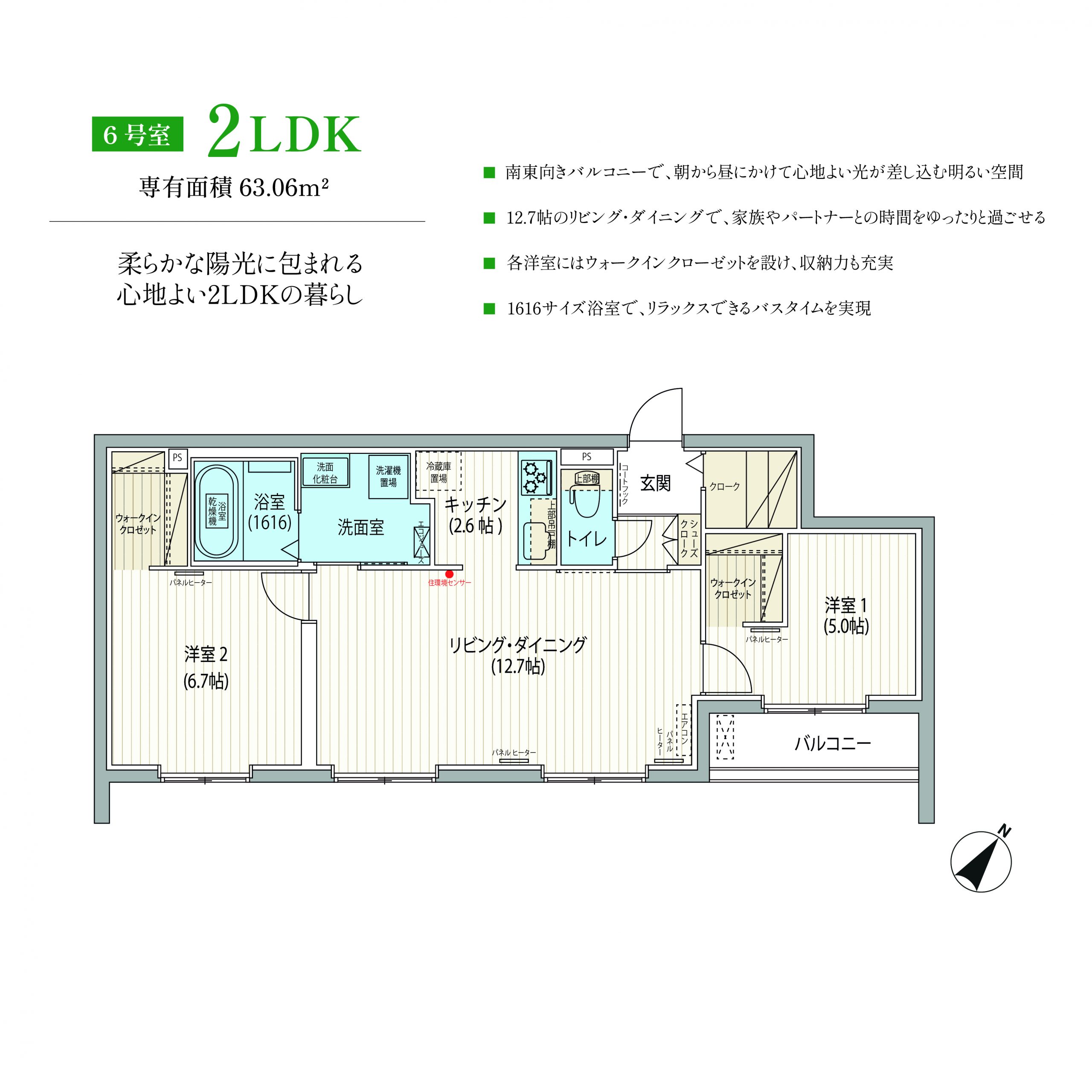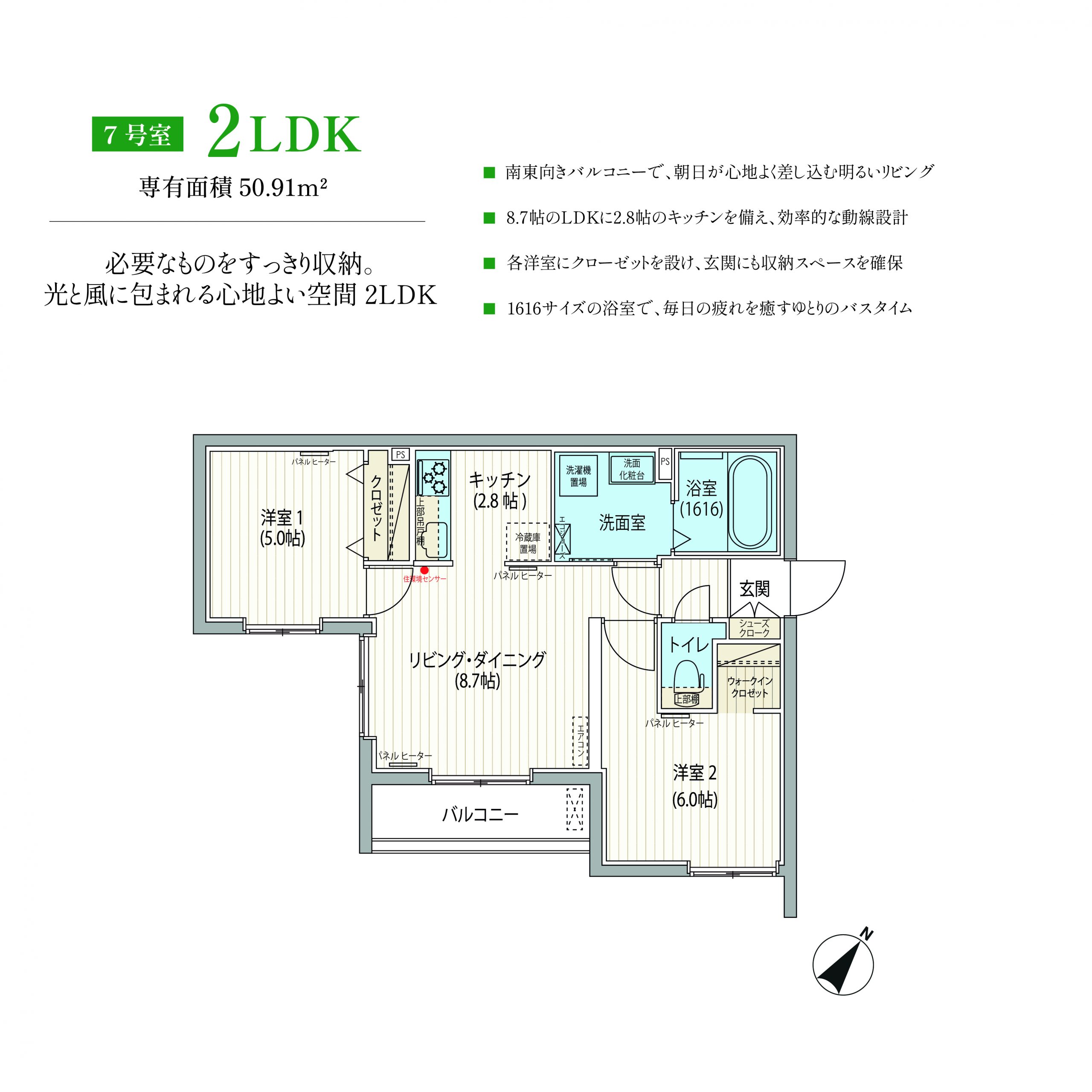 2LDK(50.91㎡、56.11㎡、60.52㎡、63.06㎡、64.10㎡、70.17㎡)、3LDK(70.75㎡)