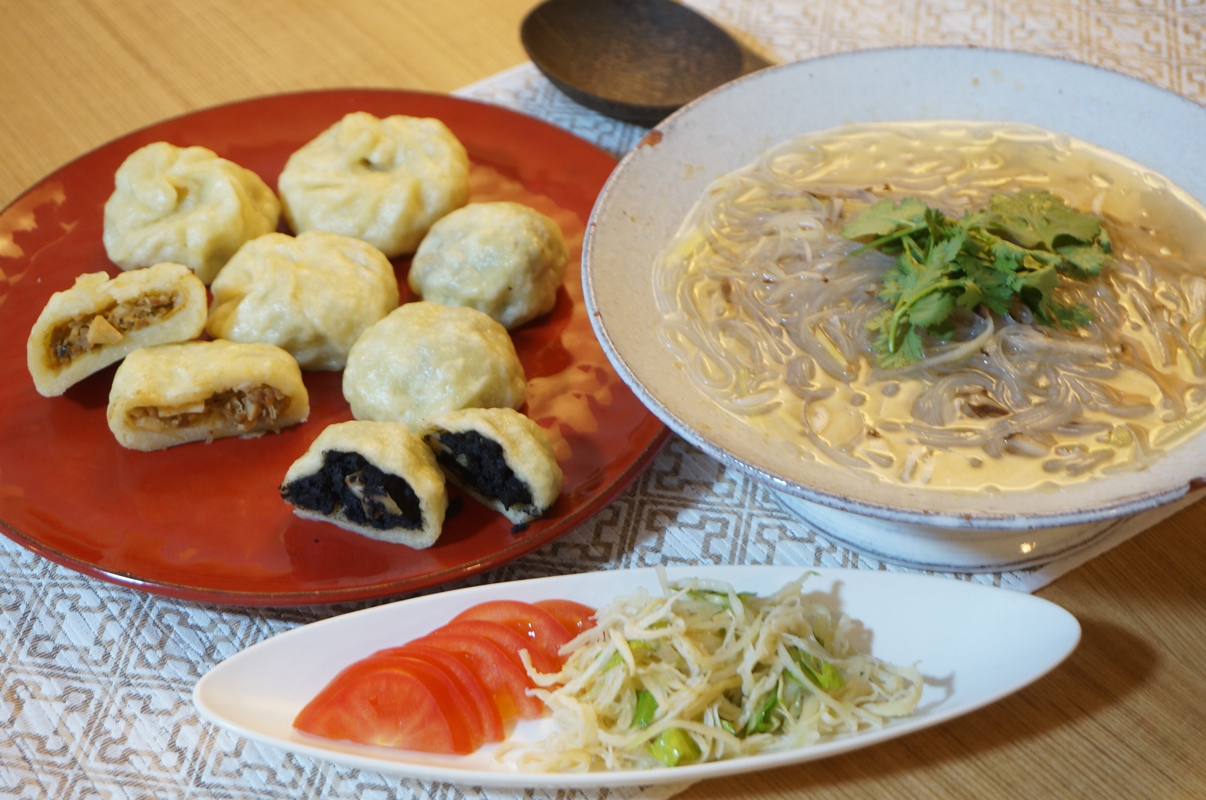 ・さきいかセロリの中華和え物・ささみ蒸しと春雨のスープ・肉まん・あんまん