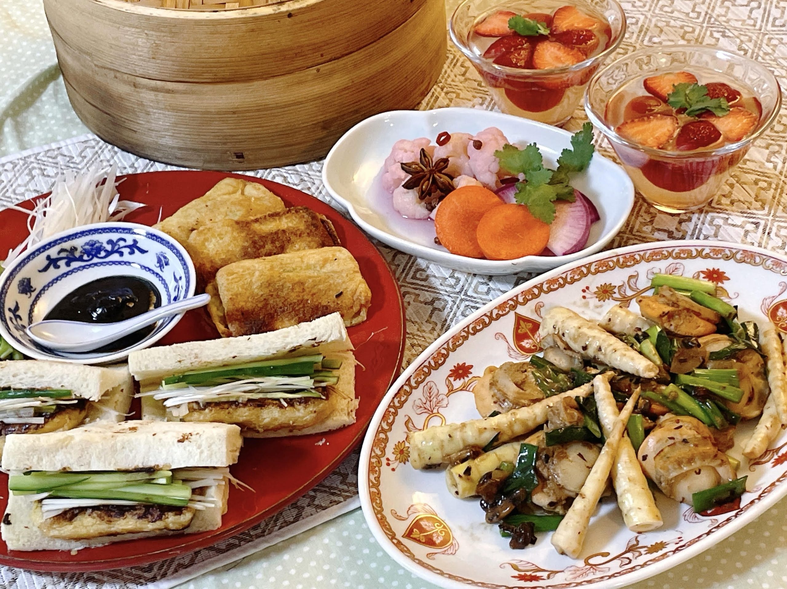 ・春色の中華ピクルス・根曲がり竹と蒸し帆立の豆豉炒め・北京ダックもどき・ミニトマトといちごのゼリー中華スパイス